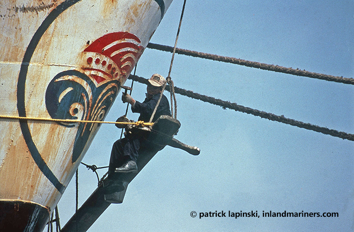 Sailor chipping paint and rust off the logo on the ship's bow.