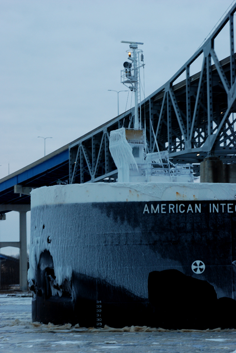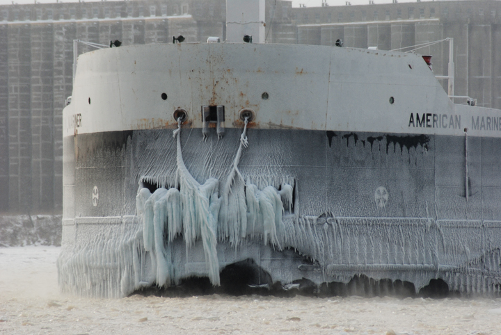 Ice covered bow of barge