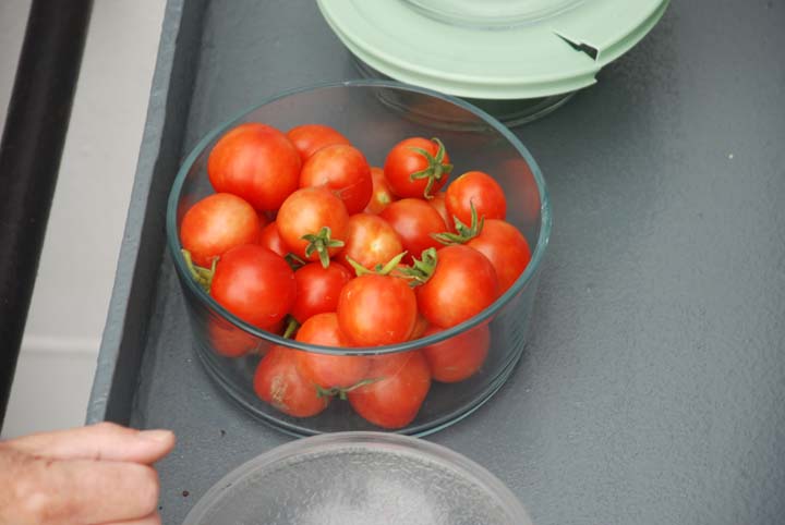 Rainwater is collected in barrels to water the port and starboard gardens.